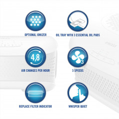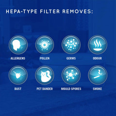 Filtri HEPA e carbone attivo per eliminare tutti gli odori; rimuove allergeni, pollini, germi, peli di animali domestici, spore di muffe e fumo