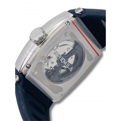 Orologio con cassa in acciaio e titanio della dimensione di 50 x 38 mm e indici stampati.